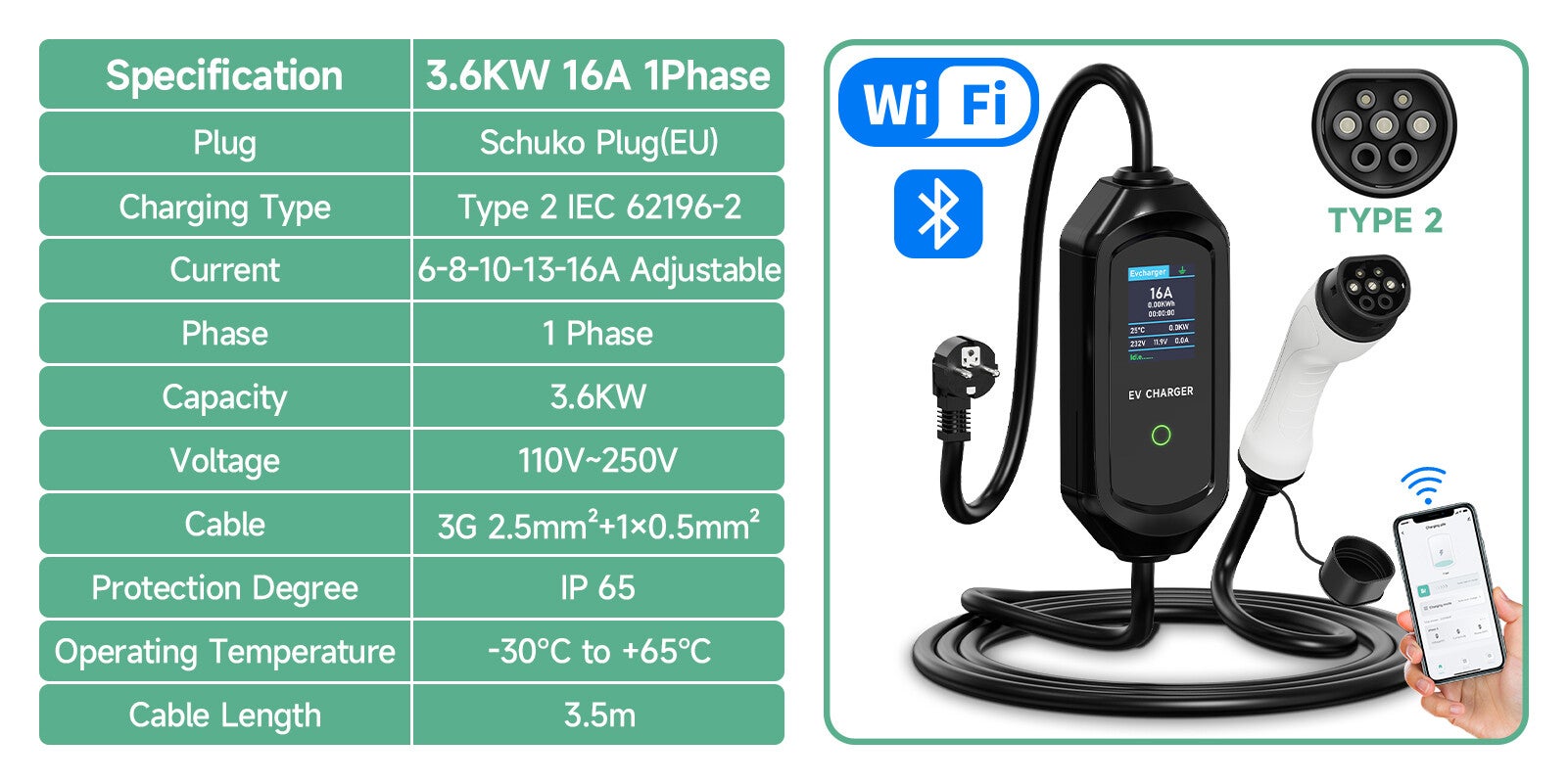 AFEEV 3.5KW chargeur EV Portable Type2 IEC62196-2 chargeur de voiture électrique 16A EVSE câble de charge rapide WiFi APP contrôle Bluetooth